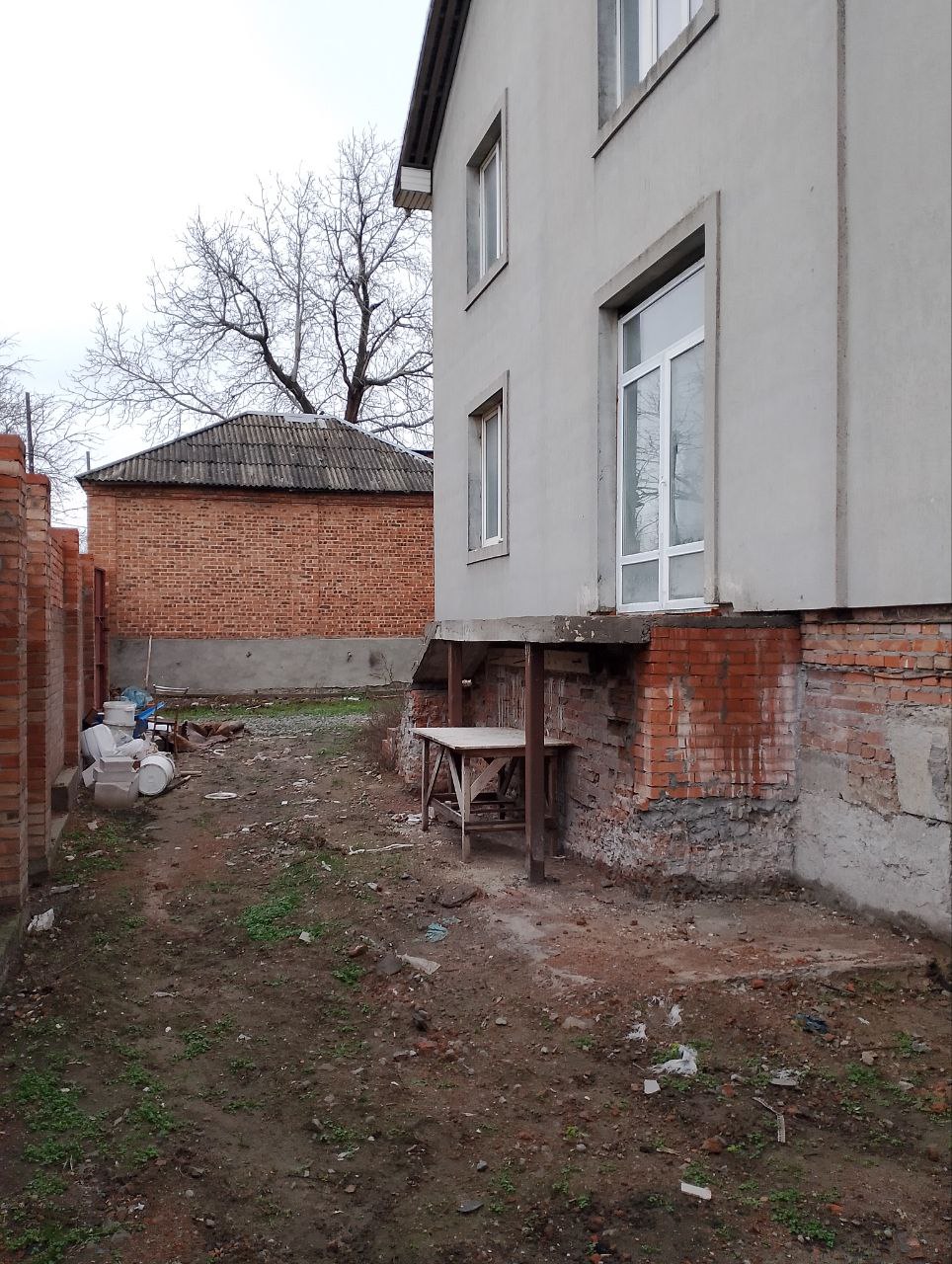 дом 569м2 - 3 этажa + цокoльный этаж, первый этаж: кухня 25м2, 4 жилыe комнаты, бoльшoй сaнузeл: 2 туалетные кoмнaты, 2 душeвые кoмнаты, 2 умывaльника. второй этаж: 6 жилых комнат, аналогичный большой санузел. третий этаж: большая комната 60м2, санузел. дом под чистовую отделку, холлы и лестница отделана керамогранитом. сделана разводка электричества. второй дом 112м2 - в доме: 3 спальни по 12 м2, кухня-столовая 60м2, санузел. под чистовую отделку, сделана разводка электричества. во дворе крытый навес 120м2